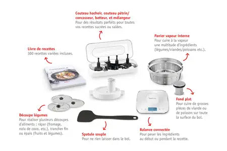 Le robot est livré avec de multiples accessoires qui vous permettent de réaliser tous les types de recettes :